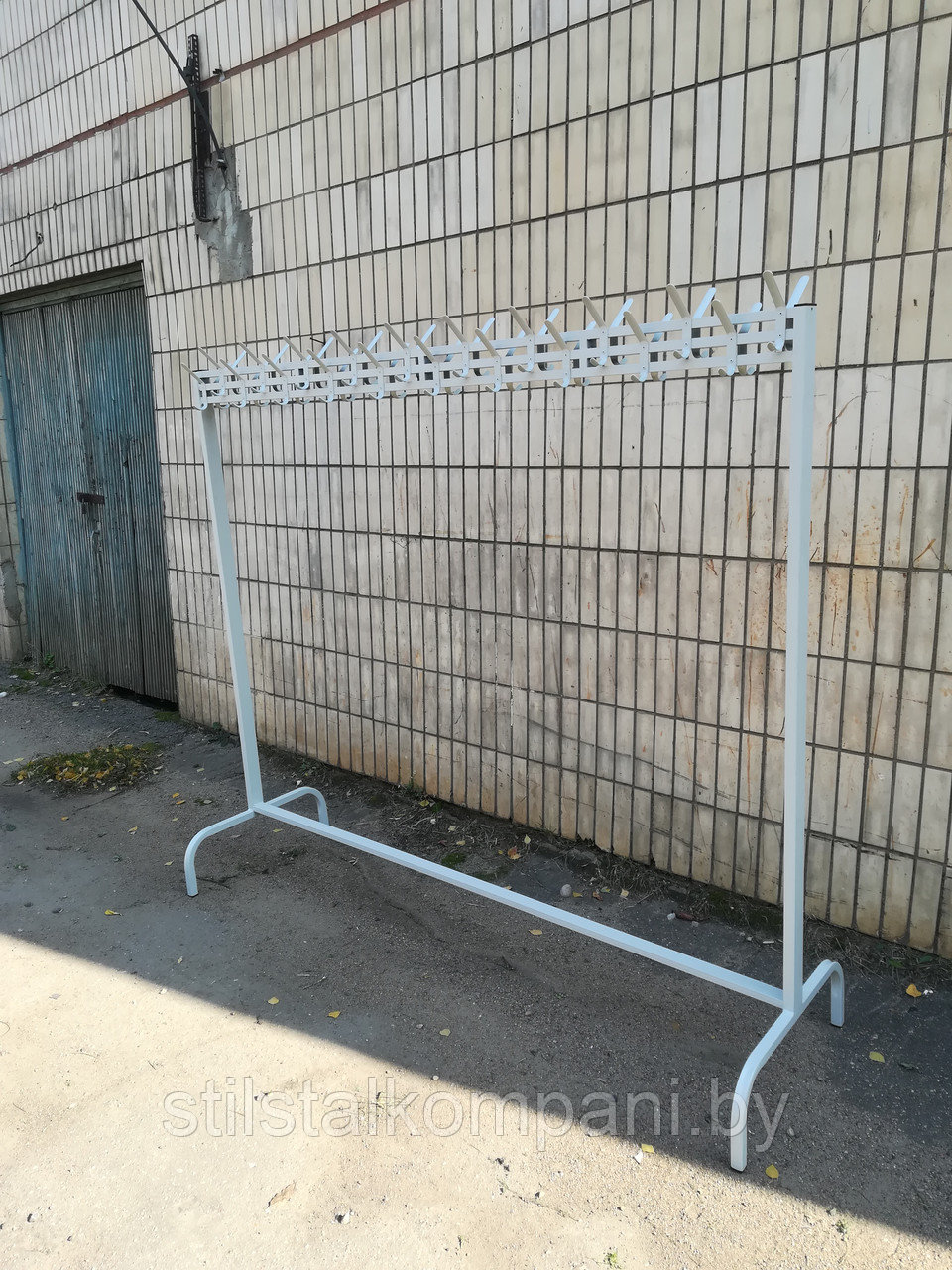 Вешалка гардеробная (двухсторонняя), островная, рассчитана на 30 шляпных + 30 для пальто крючков. По желанию заказчика количество крючков может меняться. Габариты (+-) 2000х600х1800(Н). Цельносварная конструкция, изготовлена из стальной профильной трубы 50х25, 25х25 и 40х20. Тип крючков штампованный. Покрыта порошковой эмалью. Все торцы закрыты пластиковыми заглушками.